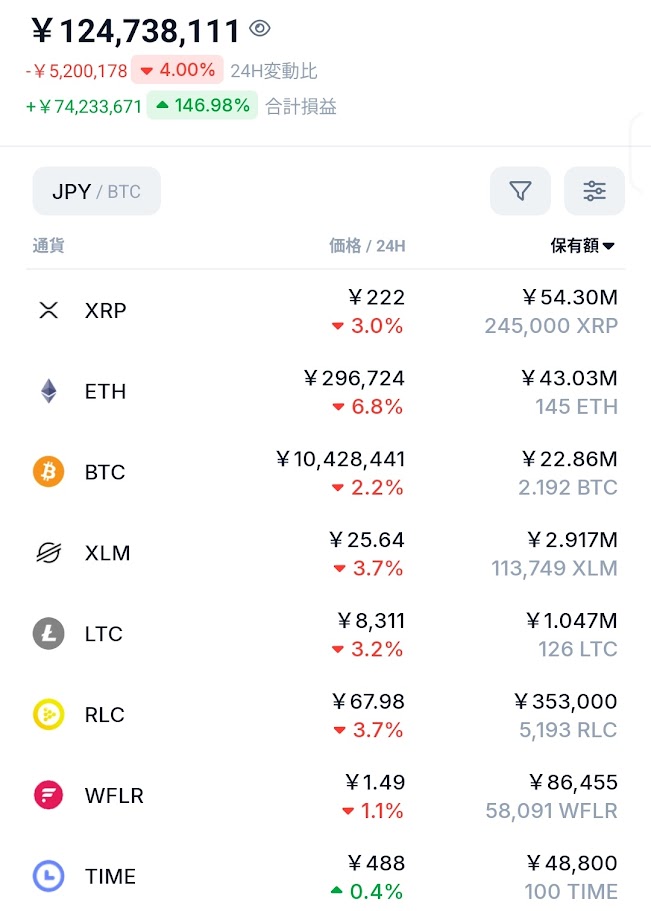 500万円減。昨夜のXRP爆上げはなんだったんだ。。。